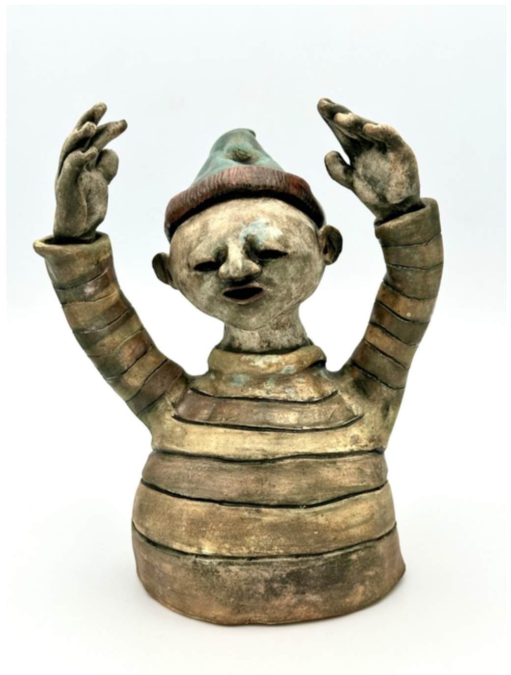 Thief portrays a figure wearing stripes and a hat, evoking the image of a criminal. Yet this person has stolen nothing – only seeking peace and solitude. The work reflects the guilt and misunderstanding that come from needing space within suffocating relationships.